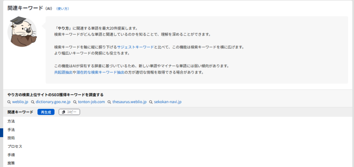 関連キーワード(AI)では、検索したキーワードに関連する単語をAI生成します。