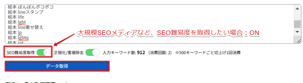 SEOメディア運営者など、SEO難易度が必要な場合は「SEO難易度取得」をONにしてデータ取得を行いましょう。