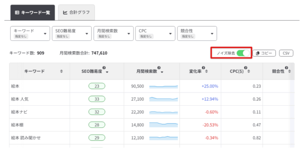 データ取得が完了したら、ノイズ除去をONにしてからキーワード選定を行いましょう。