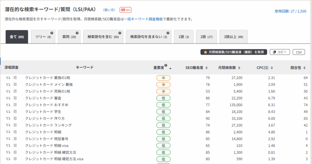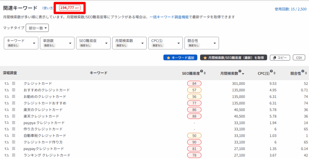 この項目では、「クレジットカード」に対して「クレジットカード おすすめ」「クレジットカード 最強の二枚」などの、検索キーワードを含む関連キーワードの取得方法を解説します。