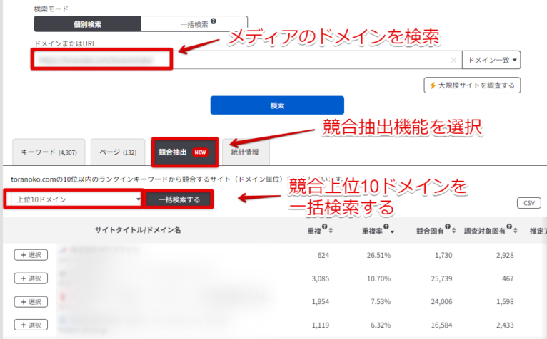 検索後、競合抽出タブを選択し、上位10ドメインを選択→一括検索するをクリックしてください。