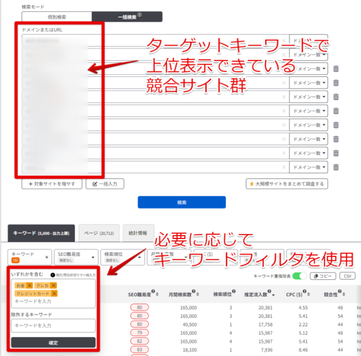 - 獲得キーワード調査:競合サイトのSEOキーワードを一括取得!