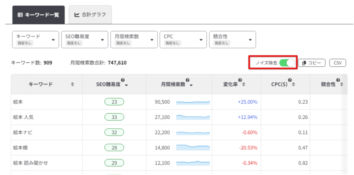 データ取得が完了したら、ノイズ除去をONにしてからキーワード選定を行いましょう。
