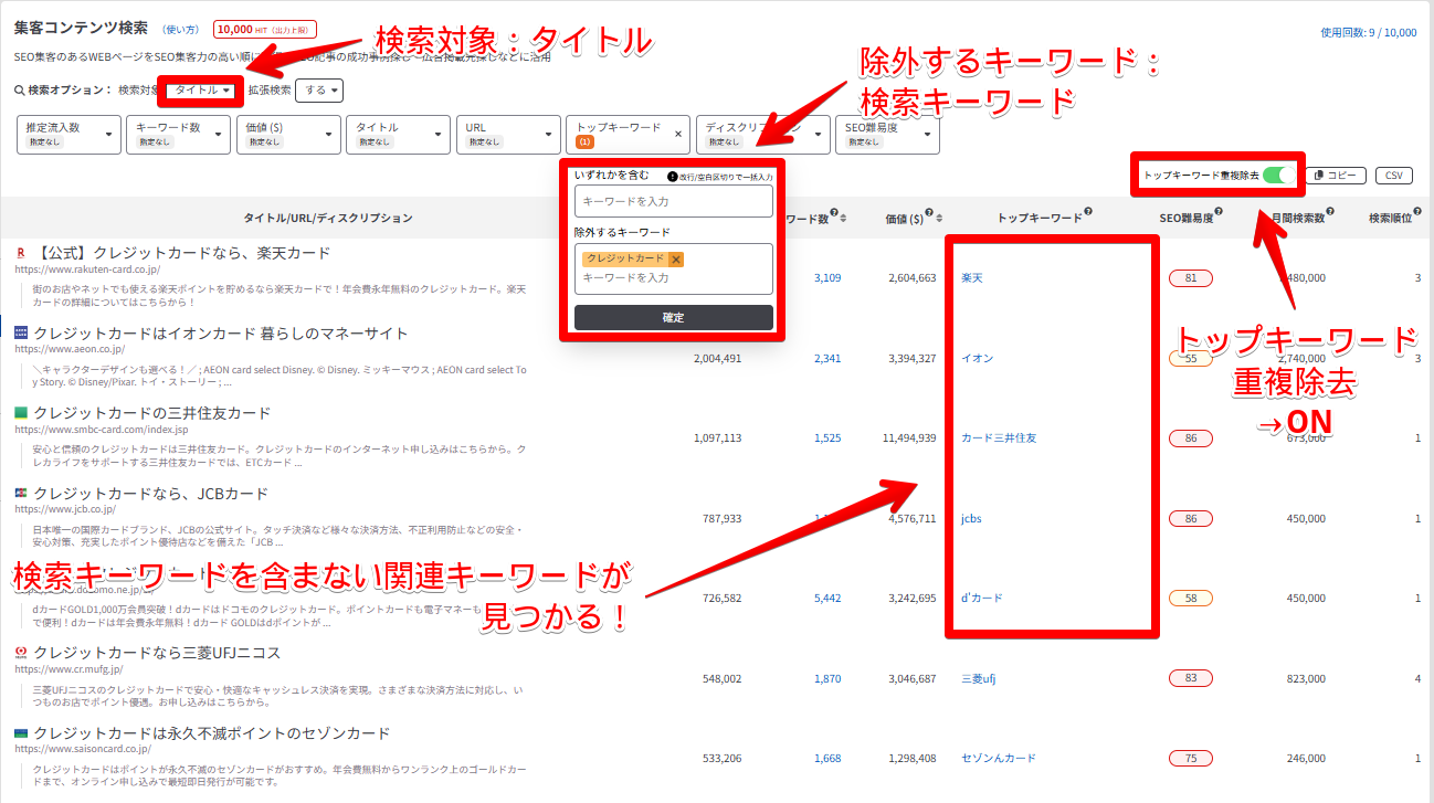 検索キーワードを含まない関連キーワード:最大5,000件 キーワードに関連するSEO集客力があるWEBページが、最もSEO流入を獲得しているキーワード。 例:「クレカ」をタイトルに含むWEBページがSEO流入を獲得しているトップキーワード一覧 |