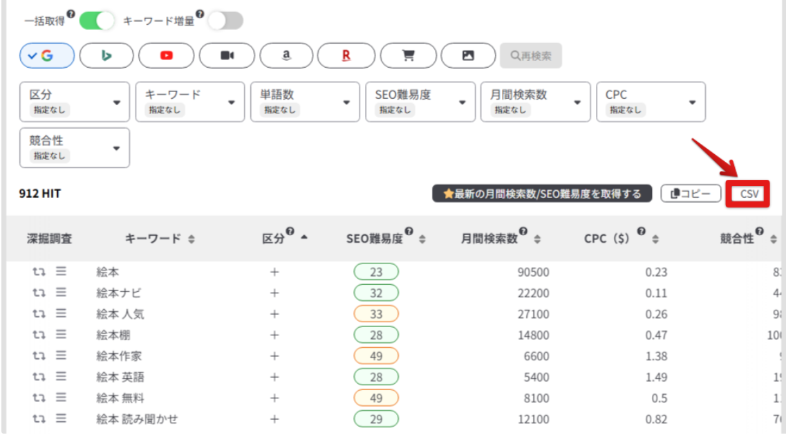 CSVダウンロードして、キーワードリストに加えましょう。