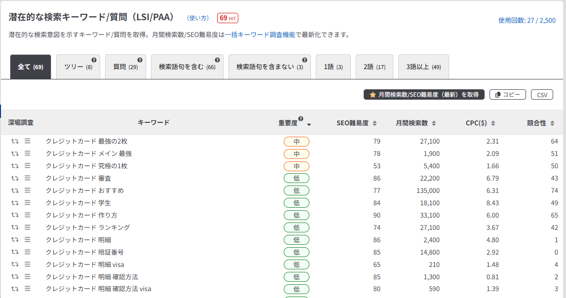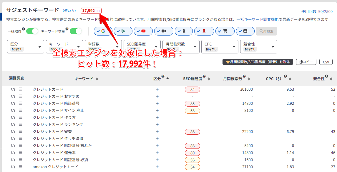 この項目では、「クレジットカード」に対して「クレジットカード おすすめ」「クレジットカード 最強の二枚」などの、検索キーワードを含む関連キーワードの取得方法を解説します。