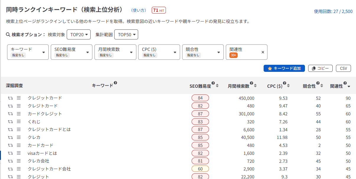 そのキーワードで上位表示できている20記事の中で、30%以上の記事がTOP50以内にランクインしているキーワードが出力されます。