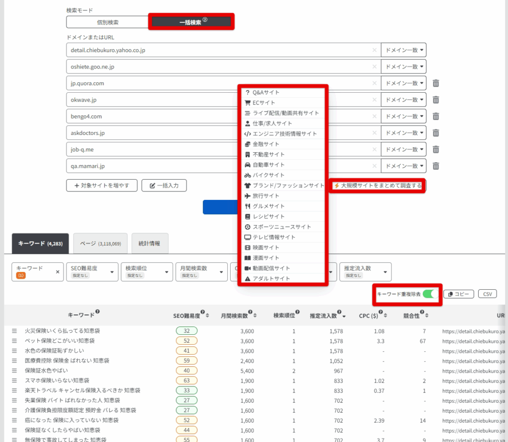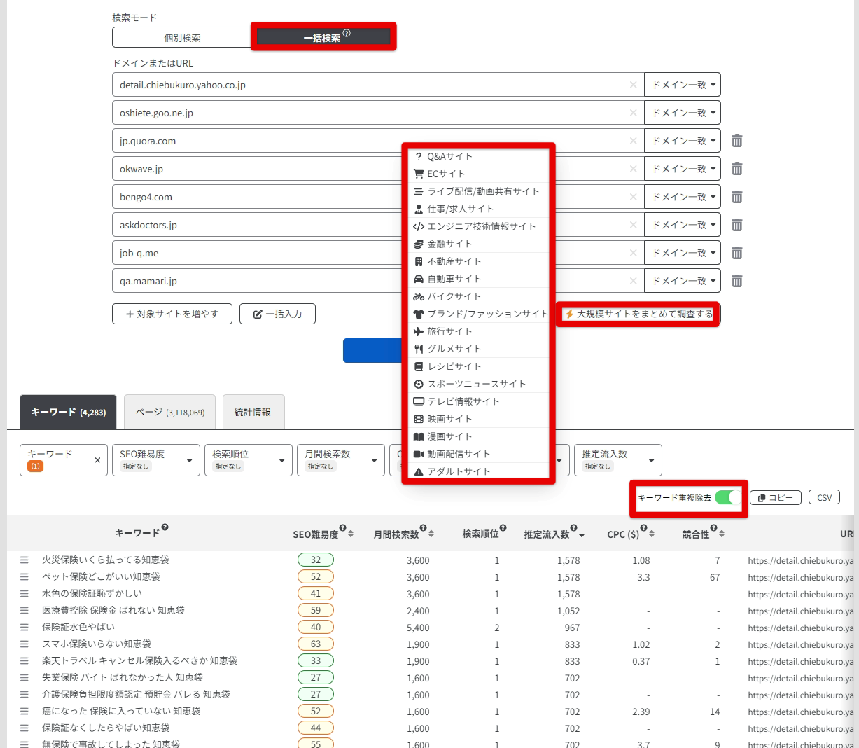 獲得キーワード調査で、検索モードを「一括検索」に変更し、「大規模サイトをまとめて調査する」ボタンをクリック→ECサイトを選択して検索します。