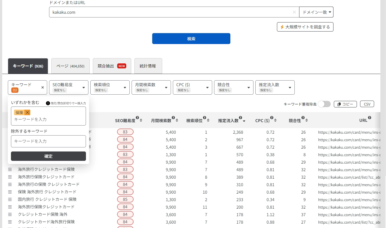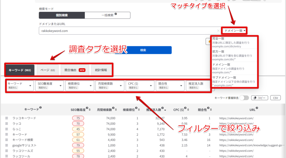 - ドメイン一致:指定したドメイン下の集客規模を調査する