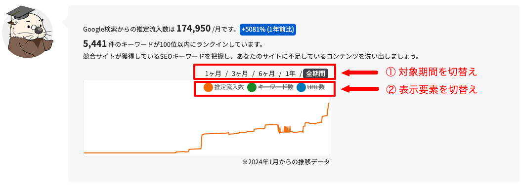 ② グラフに表示する項目(推定流入数/キーワード数/URL数)を切り替えできます。