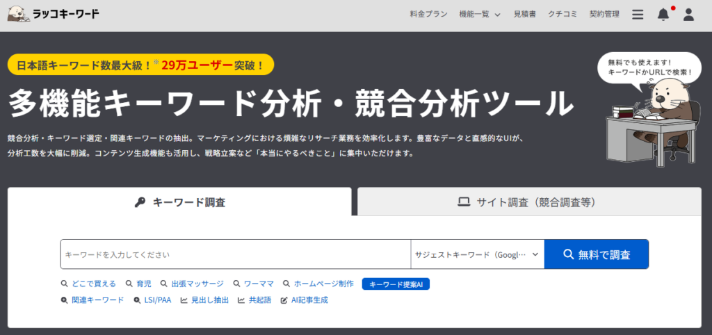 もし「広告を出さずに最初から正確な検索数が知りたい」「もっと手軽に調べたい」という場合は、ラッコキーワードの有料プラン(月額990円~)を使うのも一つの手です。Googleプランナーよりも直感的で、初心者さんにも人気です。