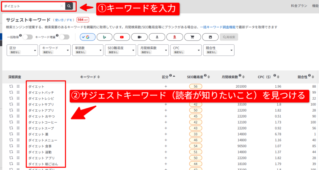 例えば以下のように「ダイエット」と検索すると、「ダイエット 食事」「ダイエット 運動」「ダイエット アプリ」といったキーワードが出てきます。これらは読者が知りたいと思っていることそのものです。