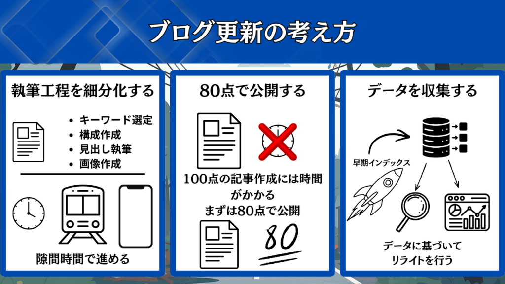 一度で完璧を目指して執筆を止めるよりも、情報の正しさを担保した状態で素早く公開し、読者の反応を見てから磨き上げるほうが、ユーザー満足度の高い記事へと成長します。