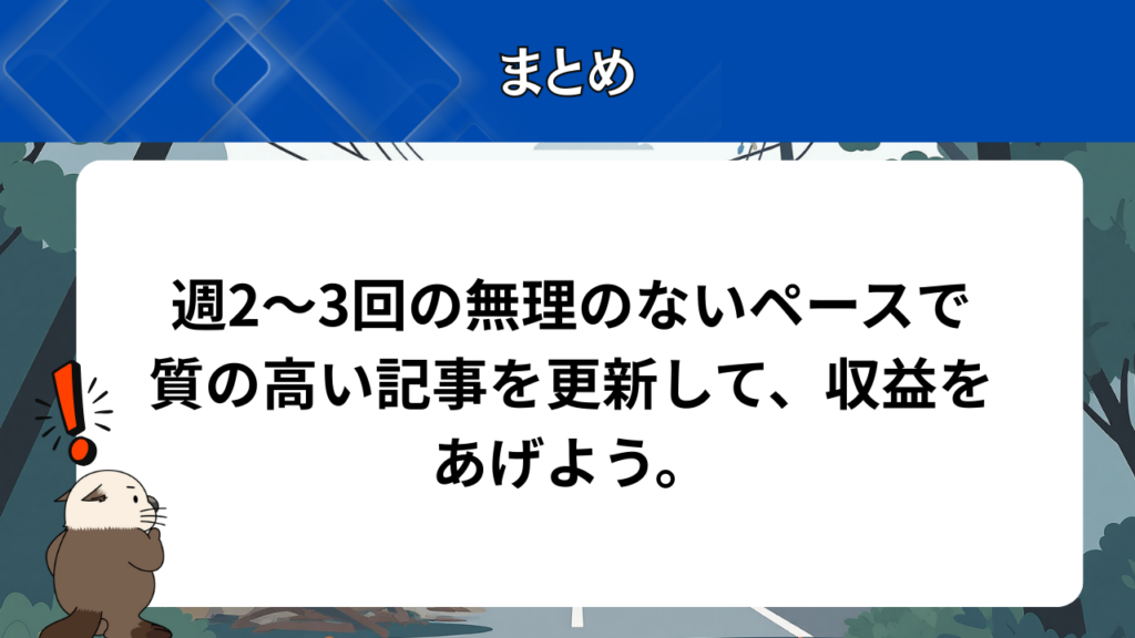 まずは週2〜3回の現実的な記事更新ペースを維持し、合計50記事の高品質な資産を積み上げることを目標にしましょう。
