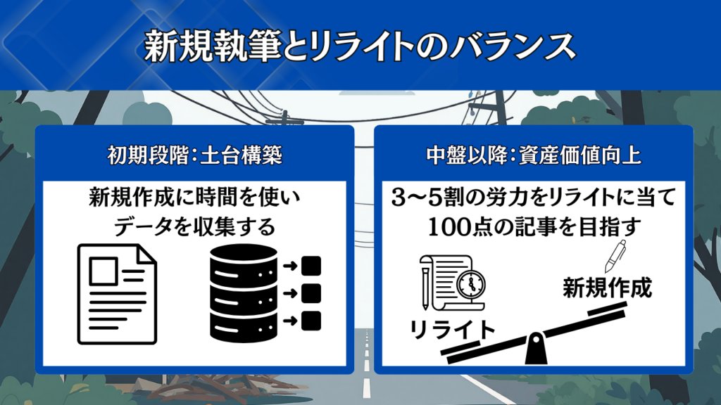 リソース配分の目安として、初期(0〜30記事)は新規作成に全力を注ぎ、中盤以降は時間の3割〜5割を既存記事の品質向上に充てることが、サイト全体の評価を底上げする戦略となります。