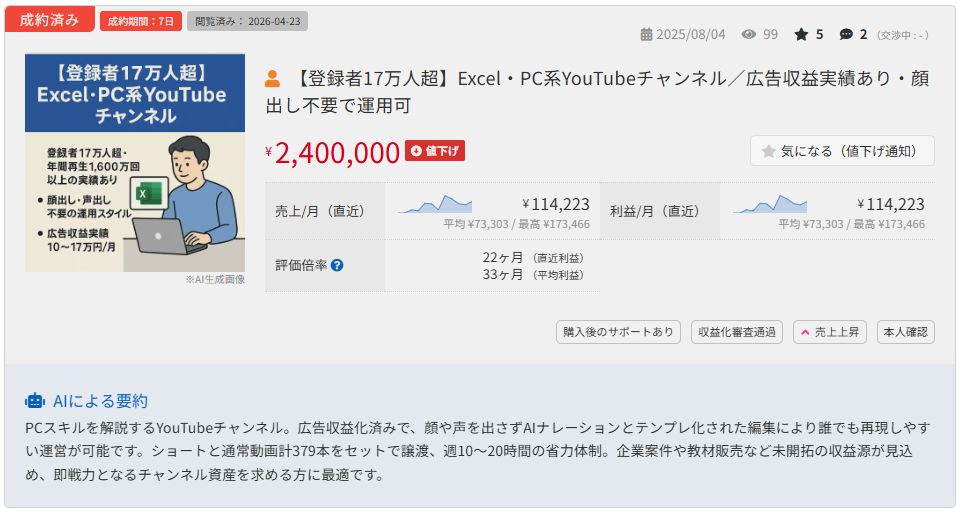 参考:【登録者17万人超】Excel・PC系YouTubeチャンネル/広告収益実績あり・顔出し不要で運用可