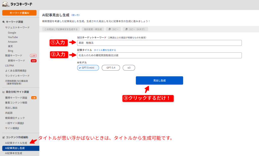 「ゆっくり解説」や「スライド解説」など、文章をベースにした動画を作る際は、ラッコキーワードの「AI記事(タイトル・見出し・本文)生成」が役立ちます。
