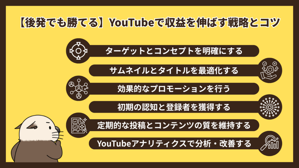 お伝えした通り、YouTubeは簡単にすぐ稼げるものではありませんが、正しい手順と戦略を持って継続すれば、後発でも収益化は十分に可能です。