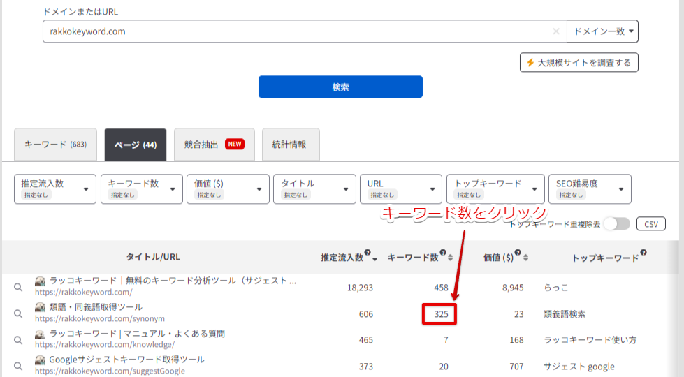 キーワード数をクリックすることで、推定流入数が2位・3位以降のキーワードを調査できます。