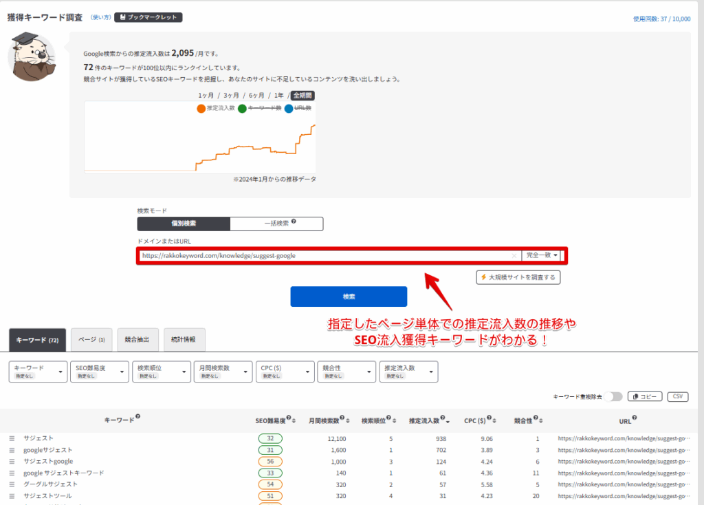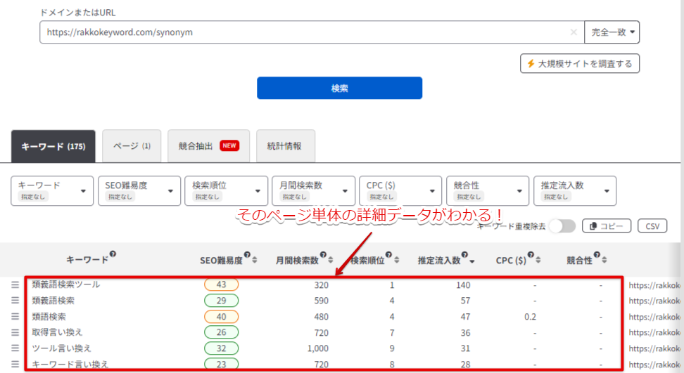マッチタイプを「完全一致」に変更すると、検索したページ単体のSEOキーワードや、過去の推定流入数の推移が表示されます。