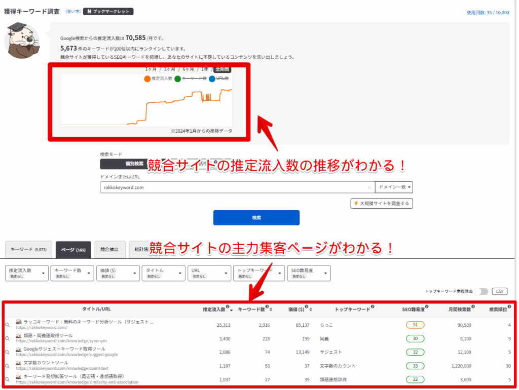 入力されたドメインを分析し、SEO集客できているページを調査します。