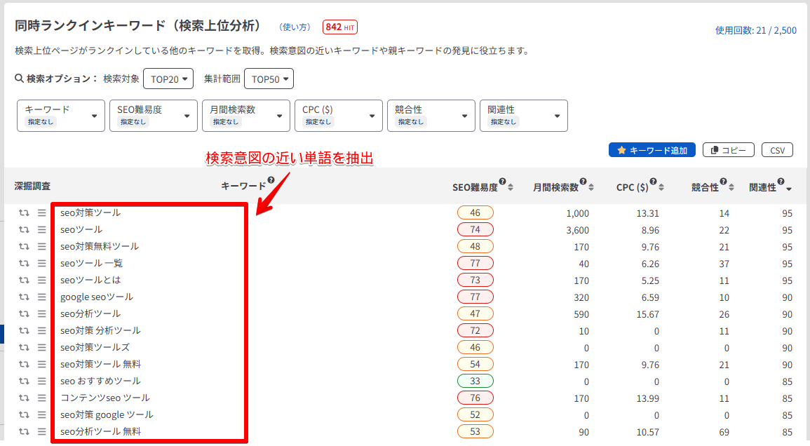 ランクインキーワードや、潜在的な検索キーワード/質問(LSI/PAA)でキーワードを検索すると、検索意図の近い別のキーワードがヒットします。