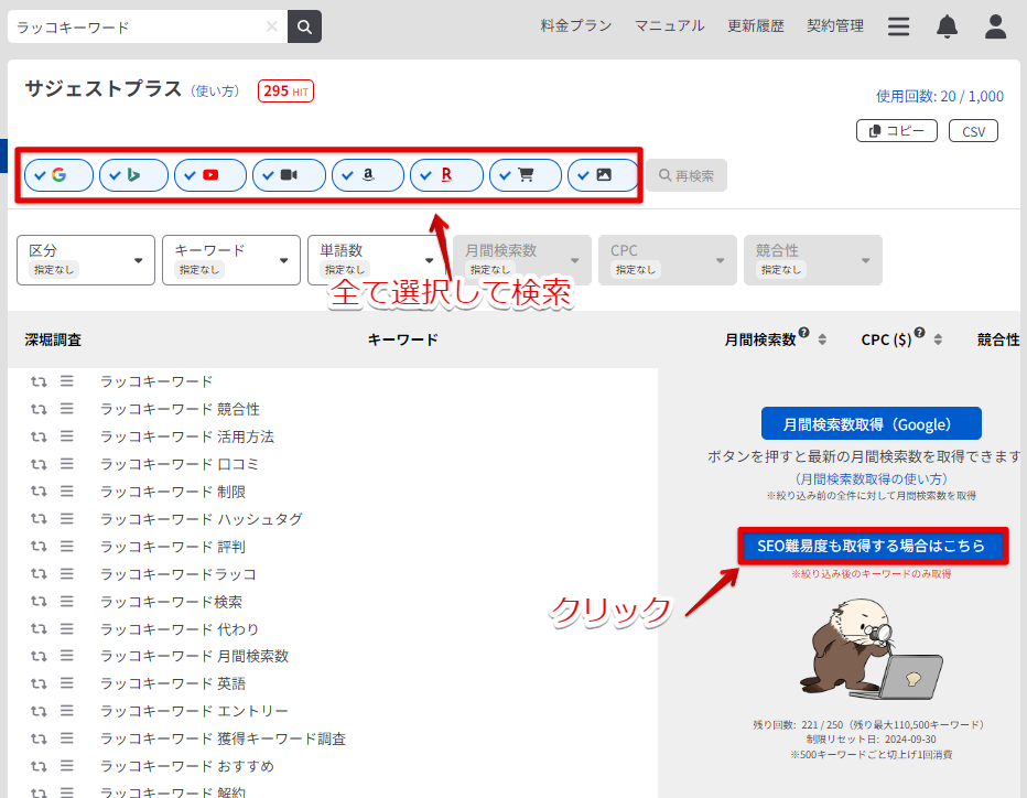 サジェストプラス画面で、検索エンジンを全て選択してキーワードを取得し、「SEO難易度も取得する場合はこちら」ボタンをクリックします。