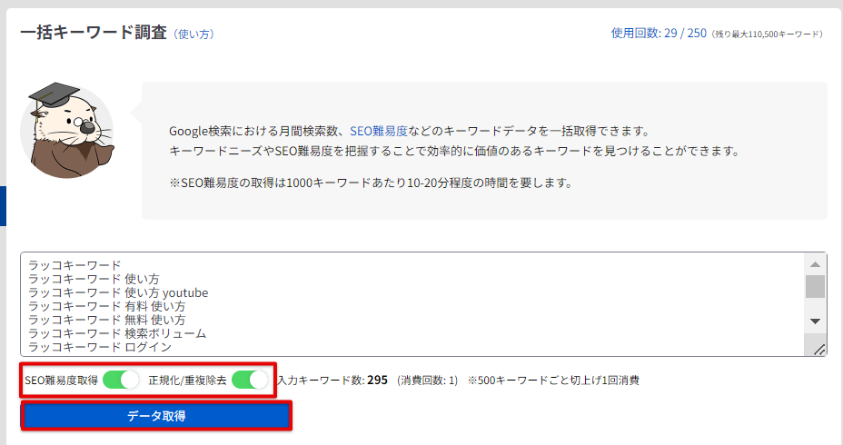 SEO難易度取得・正規化/重複除去をONにし、「データ取得」ボタンをクリックします。
