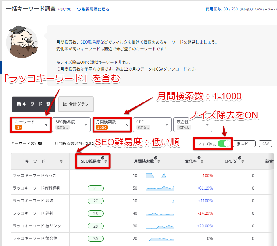 キーワード取得後は、豊富なフィルタ機能で条件に合ったキーワードを簡単に選別できます。