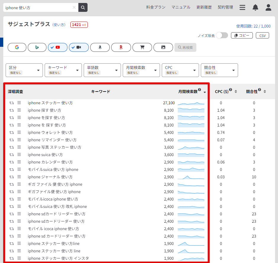 月間検索数をチェックして、視聴者がどのような悩みを持つ傾向にあるのか? を定量的に把握しましょう。