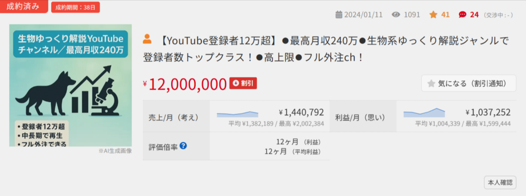 参考:【YouTube登録者12万超】⚫︎最高月収240万⚫︎生物系ゆっくり解説ジャンルで登録者数トップクラス!⚫︎高単価⚫︎フル外注ch!