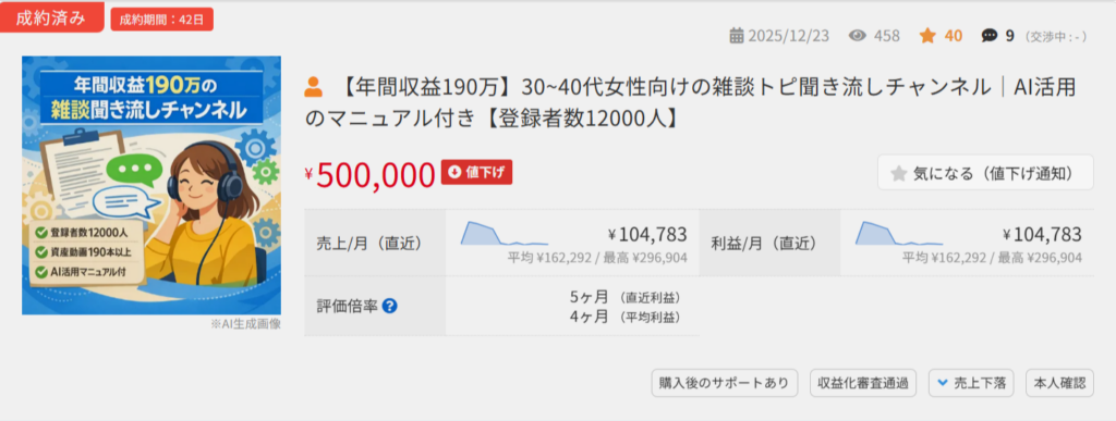 ジャンル選びをうまく行えば、安定した収入を得ることも可能です。ラッコM&Aで、すでに収益化しているチャンネルを購入すれば、早い段階で収益を出すこともできます。