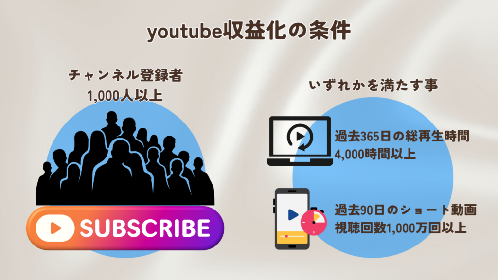 YouTubeで広告収入を得るためには、以下の2つの条件を両方満たす必要があります。
