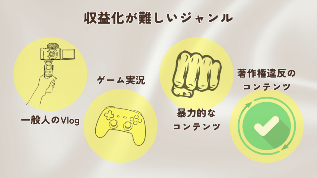 YouTubeの収益化を成功させるためには、どのジャンルで動画を作るかが極めて重要です。ここでは、初心者が避けるべきジャンルと、おすすめのジャンルを解説します。