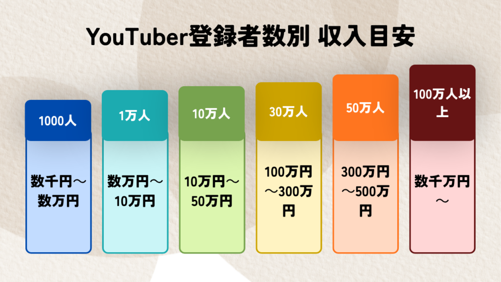チャンネル登録者10万人という目標に向けて、現在の自分の立ち位置や、今後の目標と比較ができるように、チャンネル登録者数ごとの収入の目安を順番に解説します。