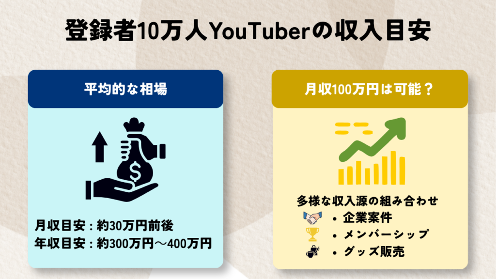 チャンネル登録者10万人のYouTuberが得る広告収入の目安は、月収およそ30万円前後です。年収に換算すると、およそ300万円から400万円となります。