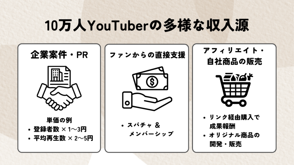 登録者10万人を達成すると、広告収益以外の収入源を得ることも可能になってきます。