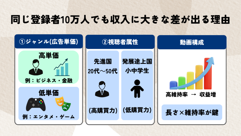 同じ登録者数でも、月収が10万円の人もいれば、月収50万円以上の人もいます。その理由は、「動画の再生回数」以外に、以下の3つの要素が大きく関係しているからです。
