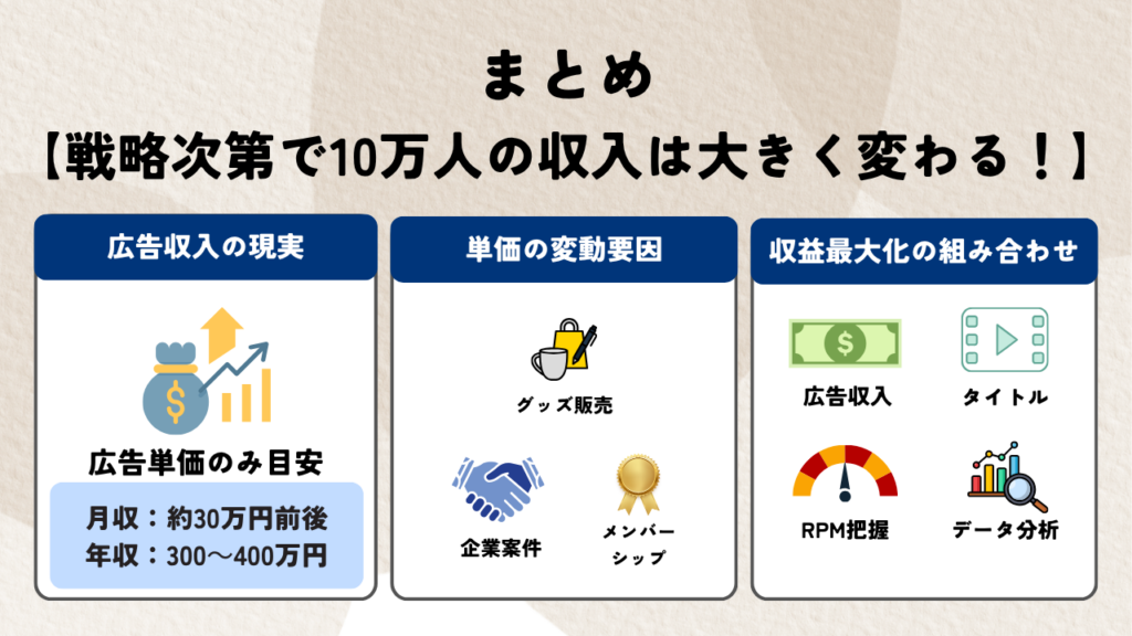 この記事では、YouTubeチャンネル登録者10万人の収入の現実と、その仕組みについて詳しく解説してきました。最後に、重要なポイントを振り返ります。