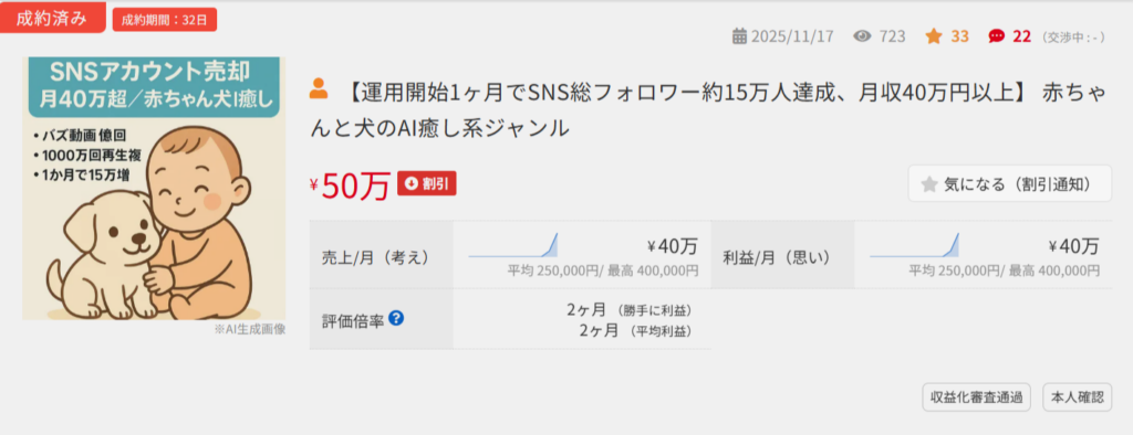 参考:【運用開始1ヶ月でSNS総フォロワー約15万人達成、月収40万円以上】赤ちゃんと犬のAI癒し系ジャンル