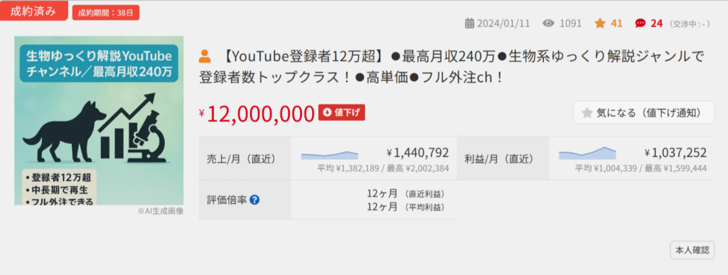 参考:【YouTube登録者12万超】⚫︎最高月収240万⚫︎生物系ゆっくり解説ジャンルで登録者数トップクラス!⚫︎高単価⚫︎フル外注ch!