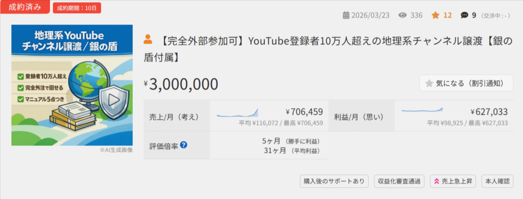 多様な収入源とは少し異なりますが、10万人という登録者数と収益化の実績があるチャンネルは、それ自体が非常に価値の高い資産になります。どうしても運営を続けるのが難しくなった場合や、新しい事業の資金にしたい場合は、「チャンネルの売却(M&A)」という選択肢もあります。